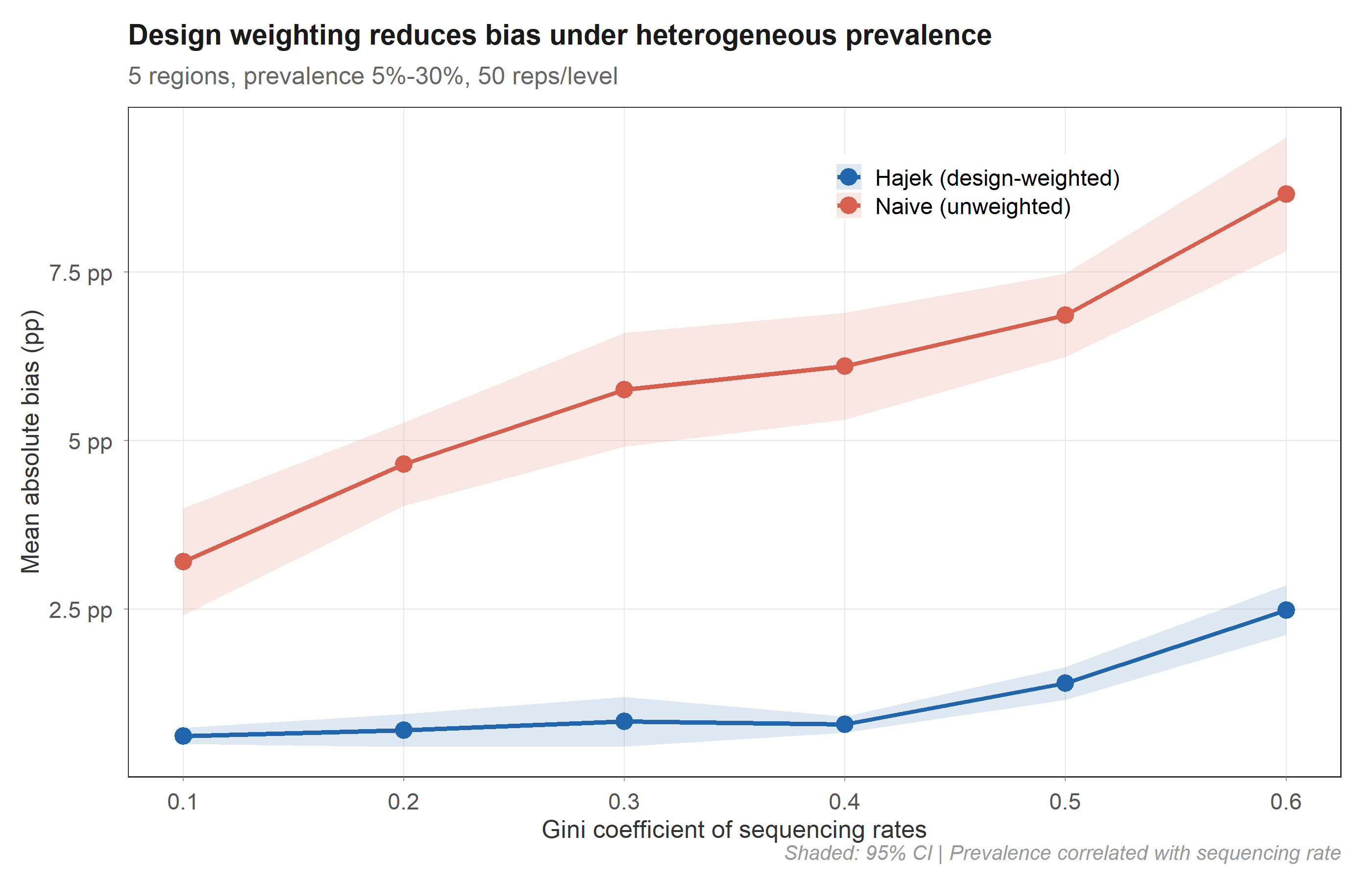 In controlled simulation (50 replicates × 6 inequality levels), the Hajek estimator maintains 0.6–2.5 pp absolute bias while the naive estimator reaches 3.2–8.7 pp. The advantage holds across all levels of sequencing inequality.