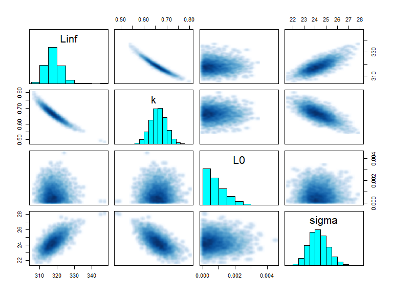 pairs(fit, pars = c("Linf", "k","L0", "sigma"))
