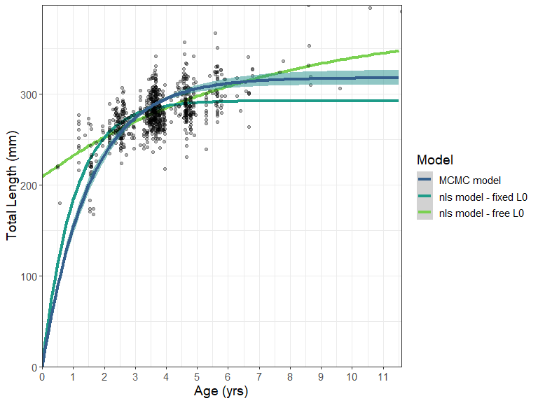 This represents a much improved fit over a standard non-linear estimated model, even if the length-at-birth were fixed at zero. Here the fit is compared using an nls model fit using the AquaticLifeHistory package.