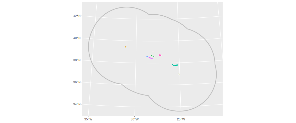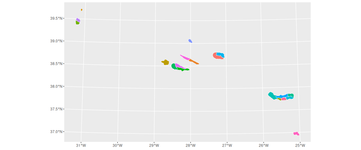 municipalities_26N()districts_25N() and districts_26N()Although those functions offer the most accurate projection, they can’t be combined into one single sf object, as this requires the same CRS for all features. Alternatively, we also offer a default LAEA projection centered on the Azores which allow all islands data in one single sf object. For these data, use these functions: