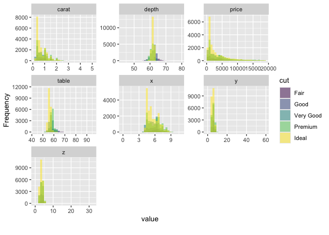 ## View quantile-quantile plot of all continuous variables by feature `cut`