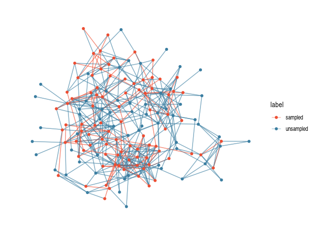 Don’t forget to check out the ggraph package, which isn’t required for EcoNetGen but provides a lot of additional great ways to plot your network. Here we plot the simulated network color-coding the sampled nodes and edges (indicated by the label “sampled” on vertices and edges):