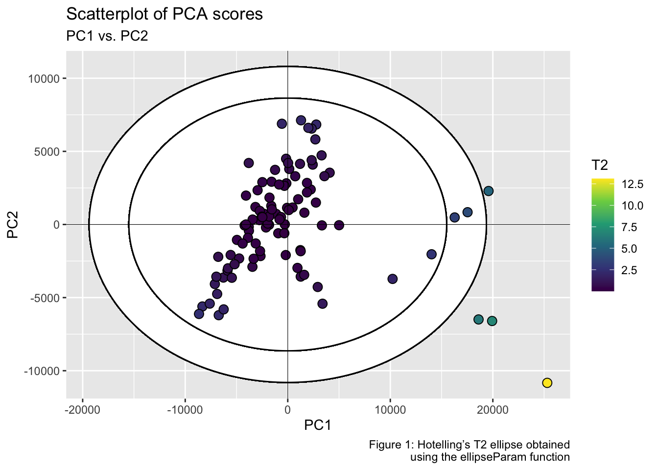 labs(title = "Scatterplot of PCA scores", subtitle = "PC1 vs. PC2", x = "PC1", y = "PC2", fill = "T2", caption = "Figure 1: Hotelling’s T2 ellipse obtained\n using the ellipseParam function") +