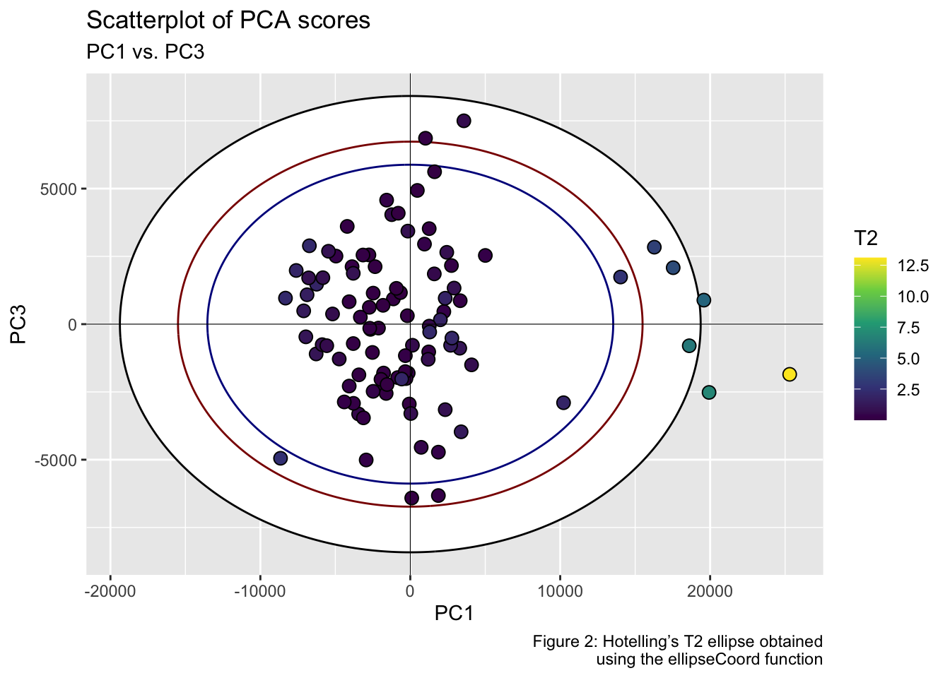 labs(title = "Scatterplot of PCA scores", subtitle = "PC1 vs. PC3", x = "PC1", y = "PC3", fill = "T2", caption = "Figure 2: Hotelling’s T2 ellipse obtained\n using the ellipseCoord function") +