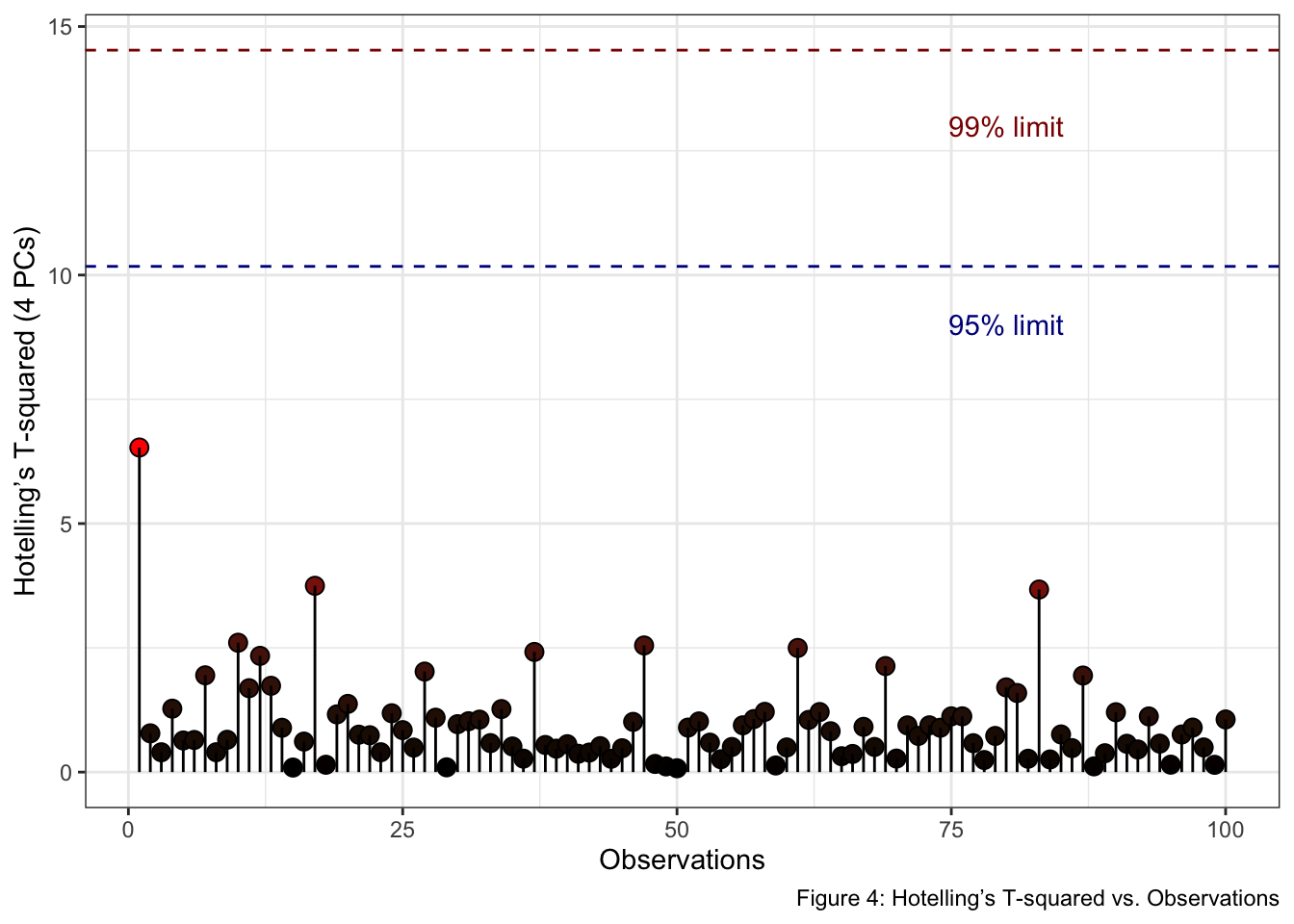 labs(x = "Observations", y = "Hotelling’s T-squared (4 PCs)", fill = "T2 stats", caption = "Figure 4: Hotelling’s T-squared vs. Observations") +