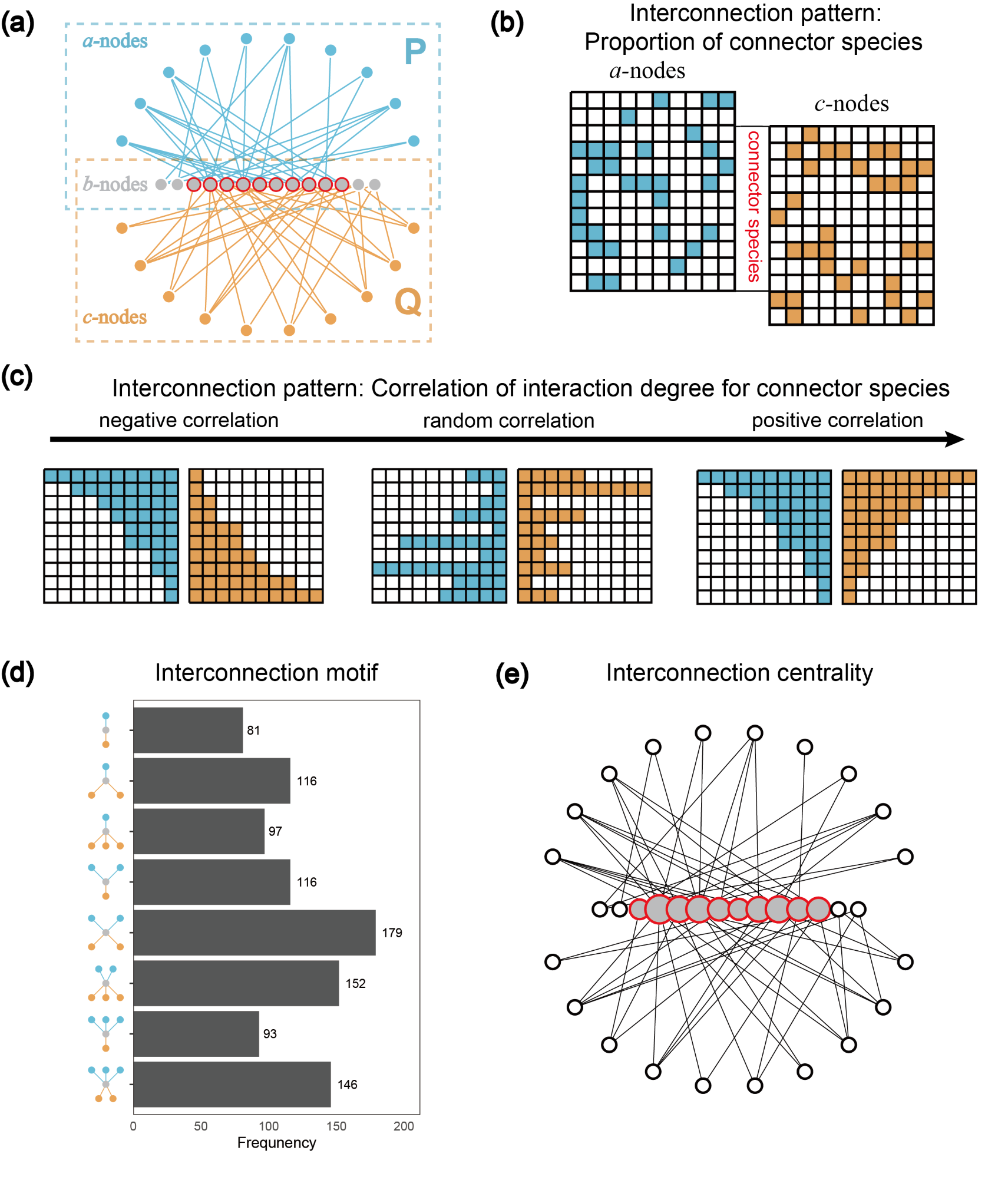 Fig.1. The visualization of an example tripartite interaction network (a, with three groups of species and two interaction subnetworks) and interconnection structures for connector species (b-c, two macro-scale interconnection patterns; d, meso-scale interconnection motif; e, micro-scale interconnection centrality). In panel a, the connector species have links from both subnetworks.