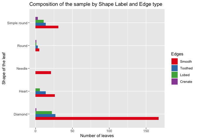 #ggplot(d11, aes(x= reorder(Shape_of_the_leaf, Percentage), y=Percentage)) + labs(y="Percentage", x="Shape of the leaf") + geom_bar(stat = "identity", width = 0.5) + geom_label(aes(label = paste0(Percentage, "%")), nudge_y = -3, size = 3.25, label.padding = unit(0.175,"lines")) + ggtitle("Composition of the Sample by the Shape Label") + coord_flip()