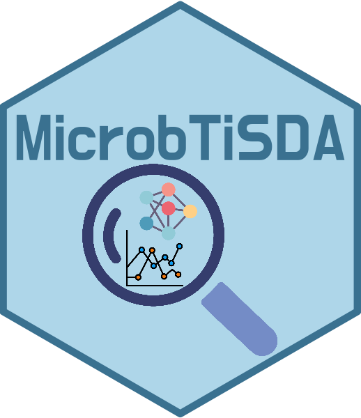 MicrobTiSDA focuses on analyzing microbiome time-series data. Its core functionalities include inferring species interaction relationships within time-series data, constructing abundance time regression models for microbial features, and assessing the similarity of temporal abundance patterns among different microbial features. It integrates the “Learning Interactions from Microbial Time Series” algorithm based on the discrete-time Lotka-Volterra model, and supports the construction of natural spline regression models to characterize changes in microbial feature abundance over time.
