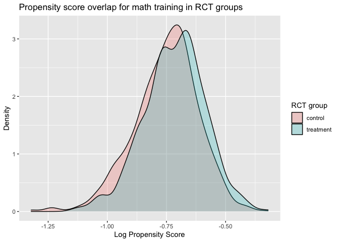 ggtitle("Propensity score overlap for math training in RCT groups") +