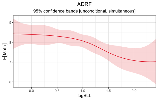 There is some relationship between logBLL and Math adjusting for the included potential confounders, based on rejection of the hypothesis that the ADRF is flat for logBLL values between -0.3567 and 2.4248 (p < .0001). There isn’t evidence that the ADRF is nonlinear within this range (p = .3153). The linear projection has a coefficient of -.643 (p < .0001), indicating that the expected potential outcome of Math decreases by this amount for each unit increase in logBLL.