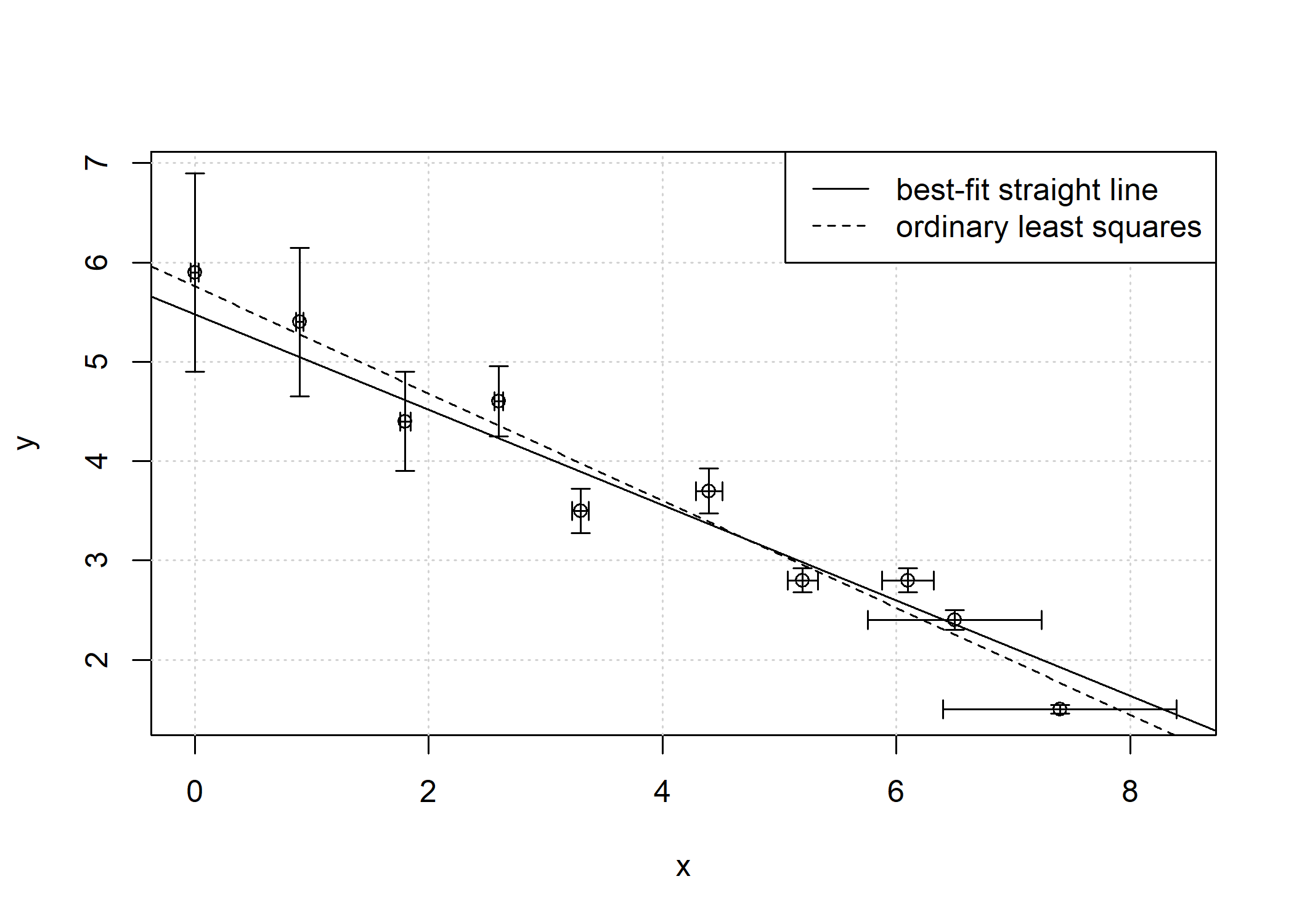 legend("topright", c("best-fit straight line", "ordinary least squares"), lty = c(1,2))