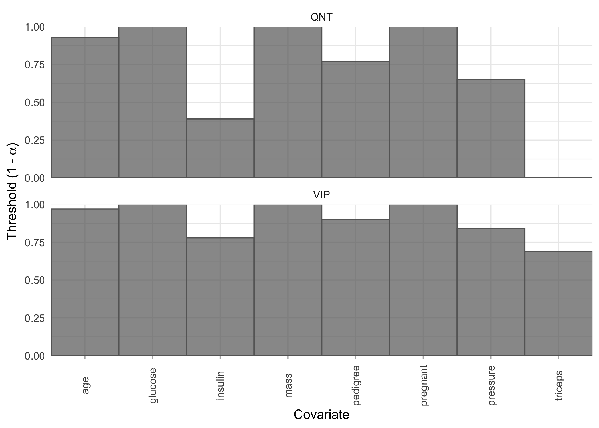 We can compare the selected variables using the VIP method to the QNT method, which selects all variables that have a 95% bootstrap confidence interval that does not contain 0: