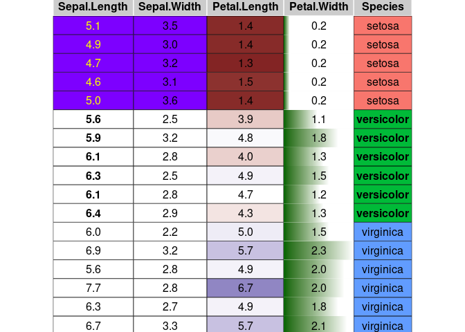 condformat(iris[c(1:5,70:75, 120:125),]) %>%