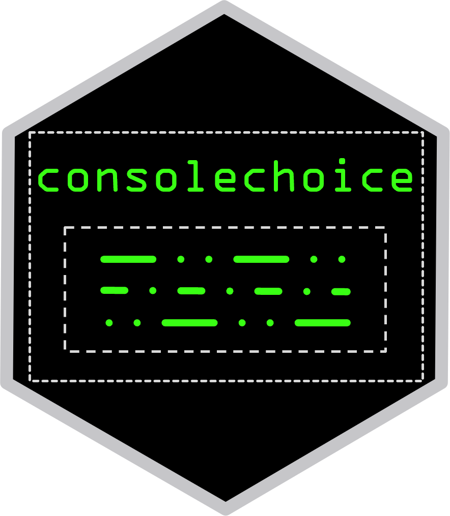 devtools::install_github("John-Piper/consolechoice")library(consolechoice)