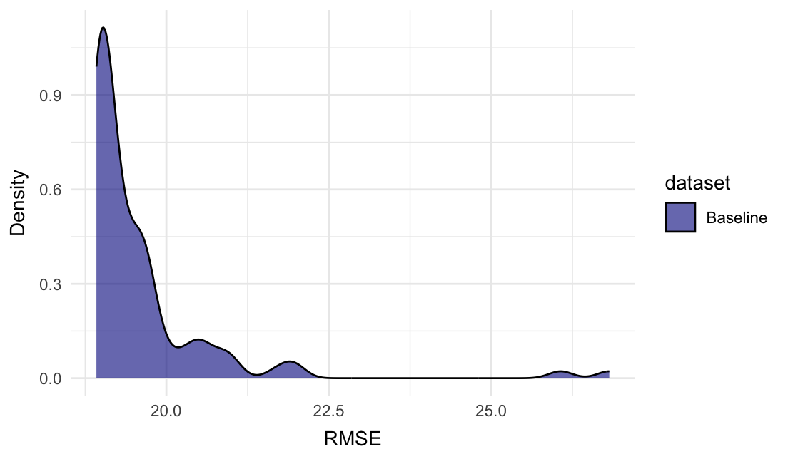 Approach: The baseline model (y ~ 1), where 1 is simply the intercept (i.e. mean of y), is fitted on n random subsets of the training set and evaluated on the test set. We also perform an evaluation of the model fitted on the entire training set.