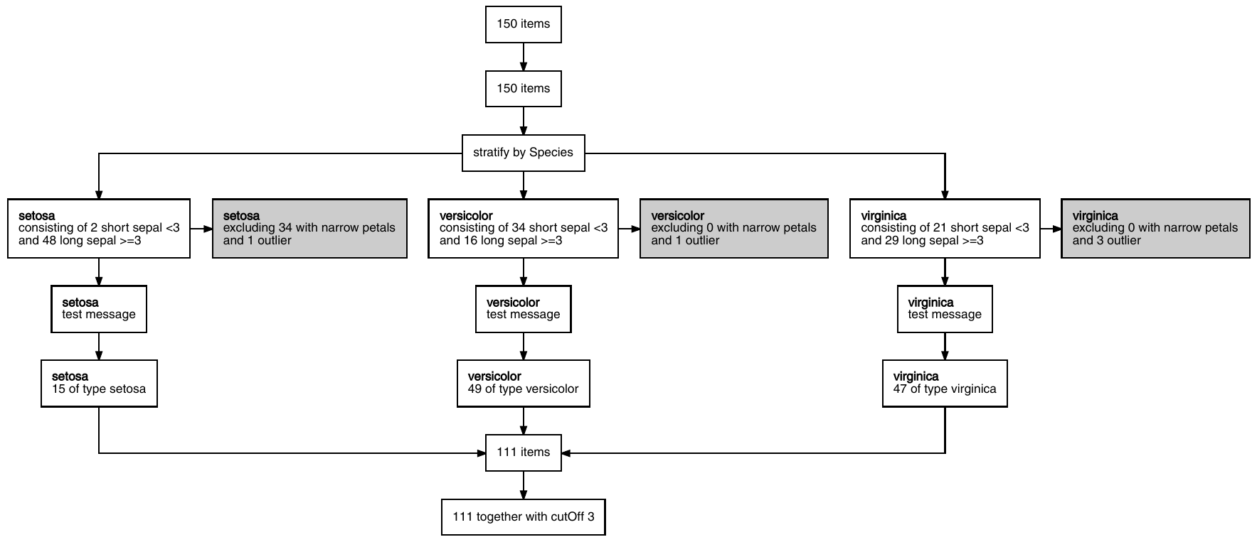 status(.messages = "{.count} together with cutOff {cutOff}") Having prepared our dataset we conduct our analysis, and want to write it up and prepare it for submission. As a key part of documenting the data pipeline a visual summary is useful, and for bio-medical journals or clinical trials often a requirement.