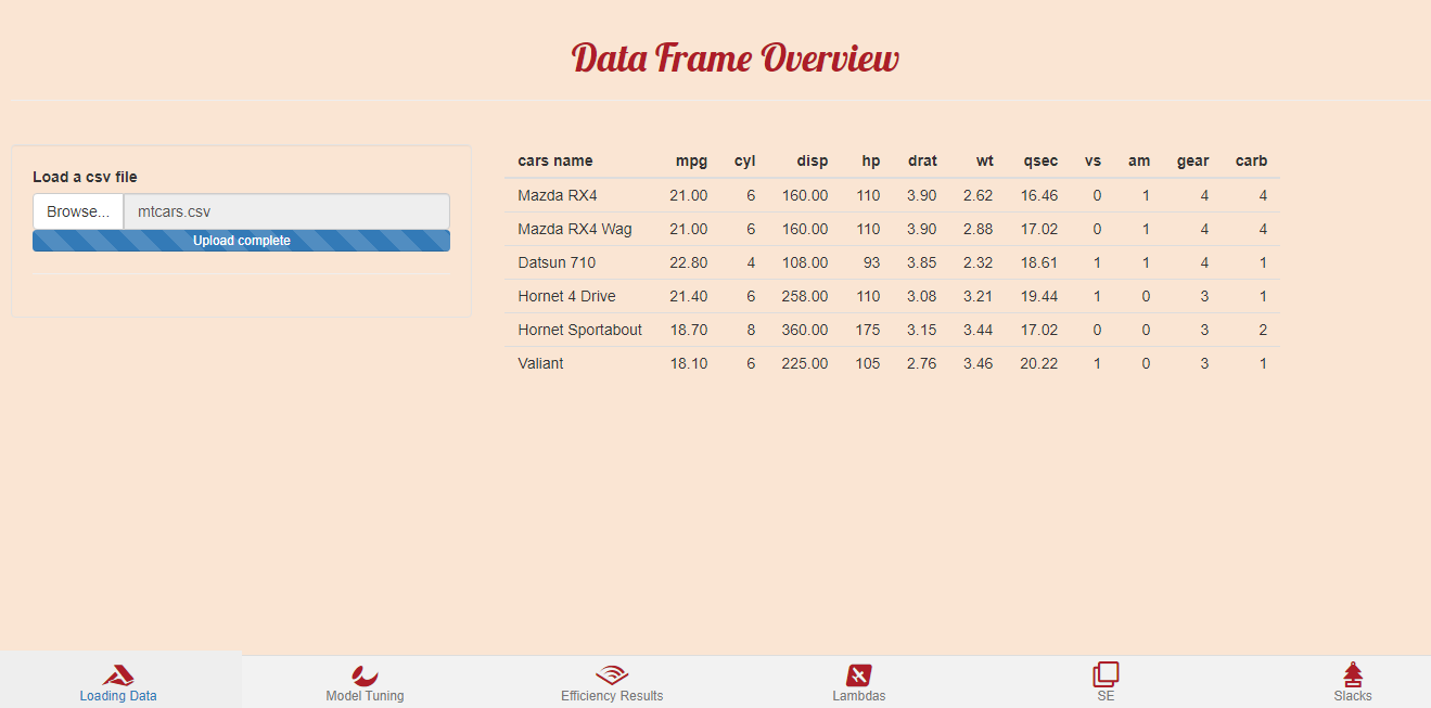 In the following examples, we use the mtcars data frame which has been exported in a csv format with an additional column: cars name.