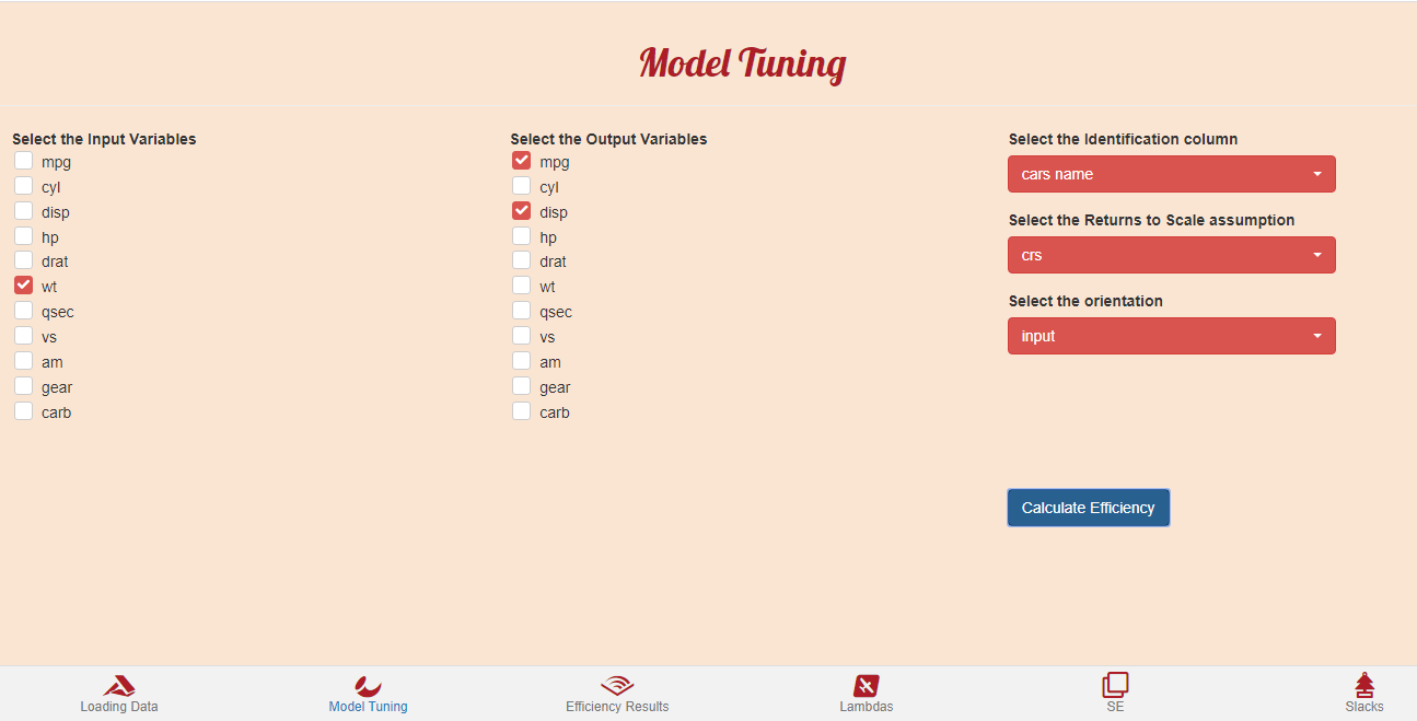 Within the Model Tuning tab, you will select the input and output variables, then you determine your identification column. Then you choose the Returns to Scale assumption between: crs, vrs, irs, drs, add and fdh. After that, you determine the orientation of the model, whether input or output. Finally, hit Calculate Efficiency to get the results.