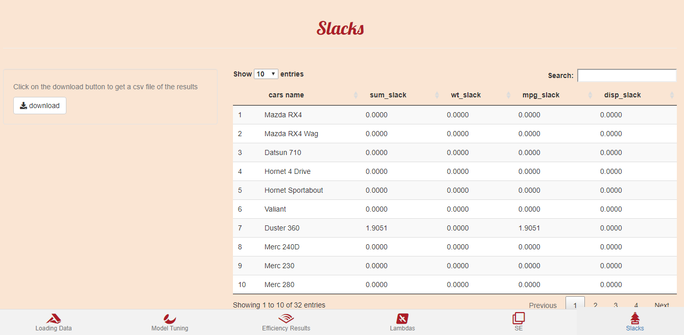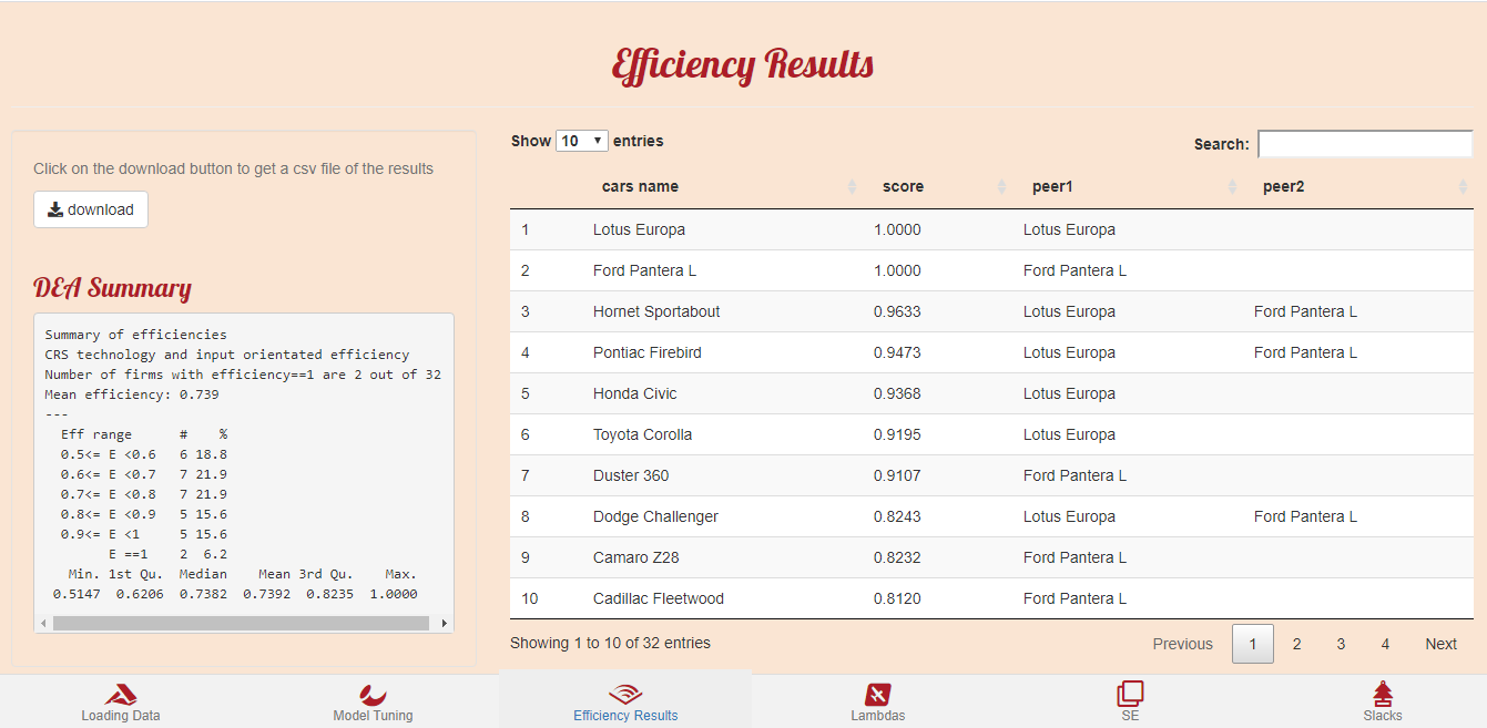 The Efficiency Results tab displays the efficiency scores along with the peers for each unit in a descending order. You have the ability to download the result in a csv format. The tab also provides a summary of the distribution of the efficiency scores.