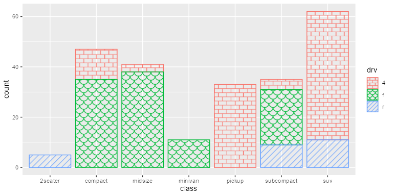 ggplot(mpg, aes(x = class, color = drv, fill = drv)) +