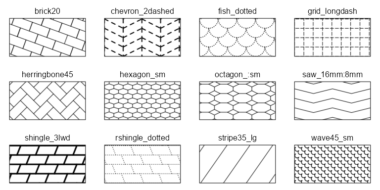 Use any of these pattern names in fill_pattern() or scale_fill_pattern().