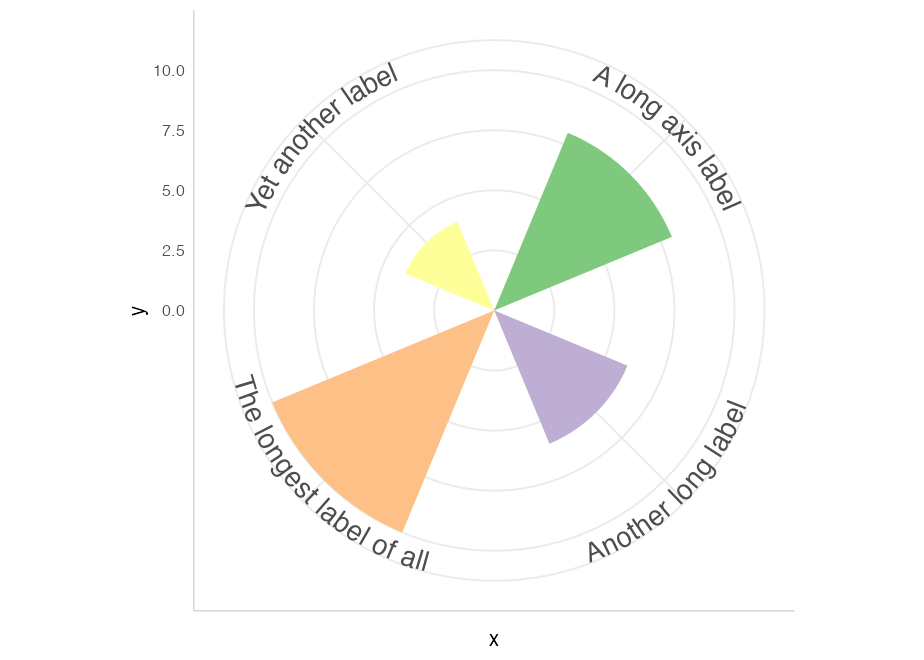 This can be useful to achieve a particular aesthetic effect (as above), but can also be of practical utility when axis labels are long, which can produce some problems in standard coord_polar: