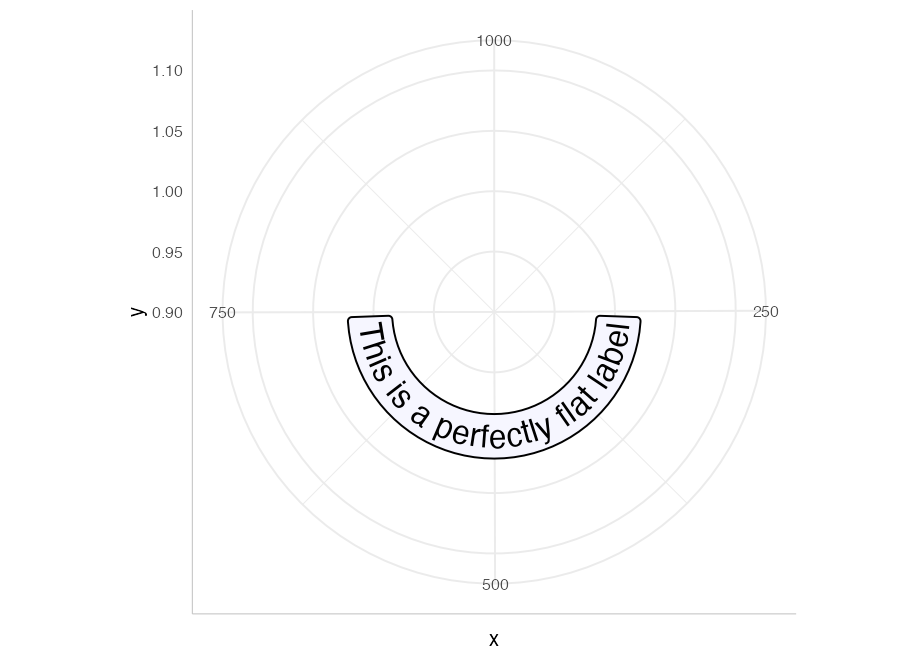 We have included the ability to have point-like text paths. While this sounds paradoxical, it means that geom_textpath can be used as a drop-in for geom_text, and will behave in much the same way, with the exception that the text will automatically curve in polar co-ordinates. Compare geom_textpath used in Cartesian co-ordinates: