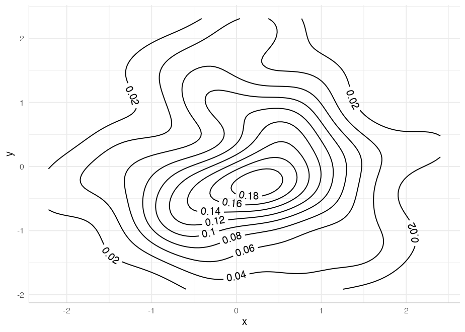 We also have geom_textdensity2d and geom_labeldensity2d for the common use case of 2D density contours:
