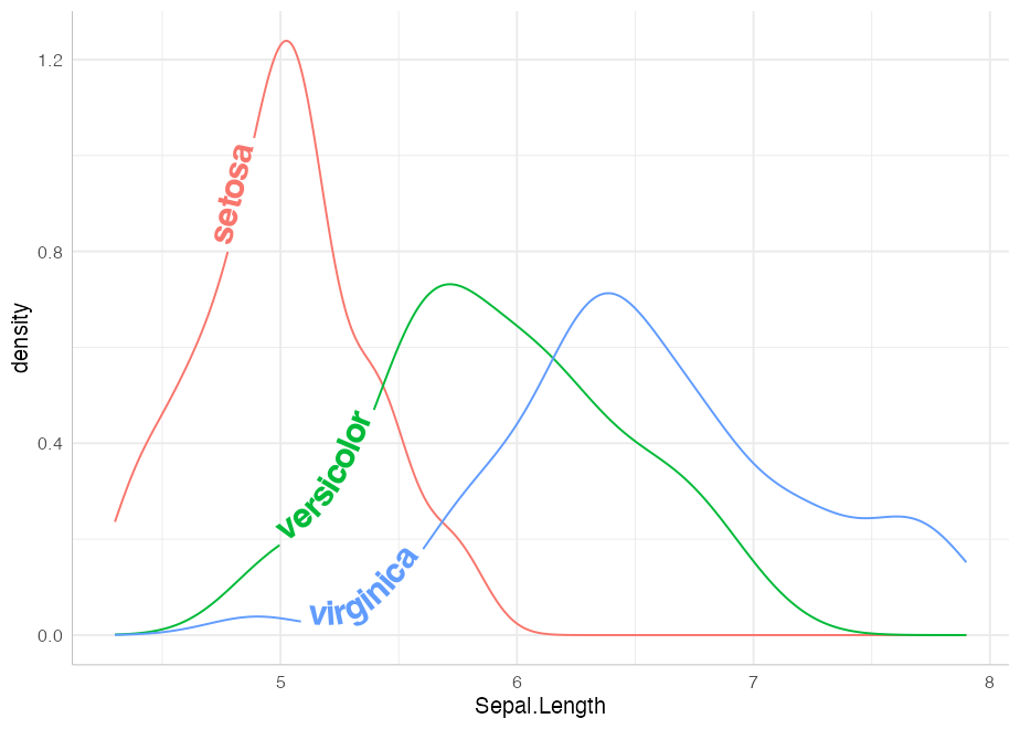 ggplot(iris, aes(x = Sepal.Length, colour = Species, label = Species)) +
