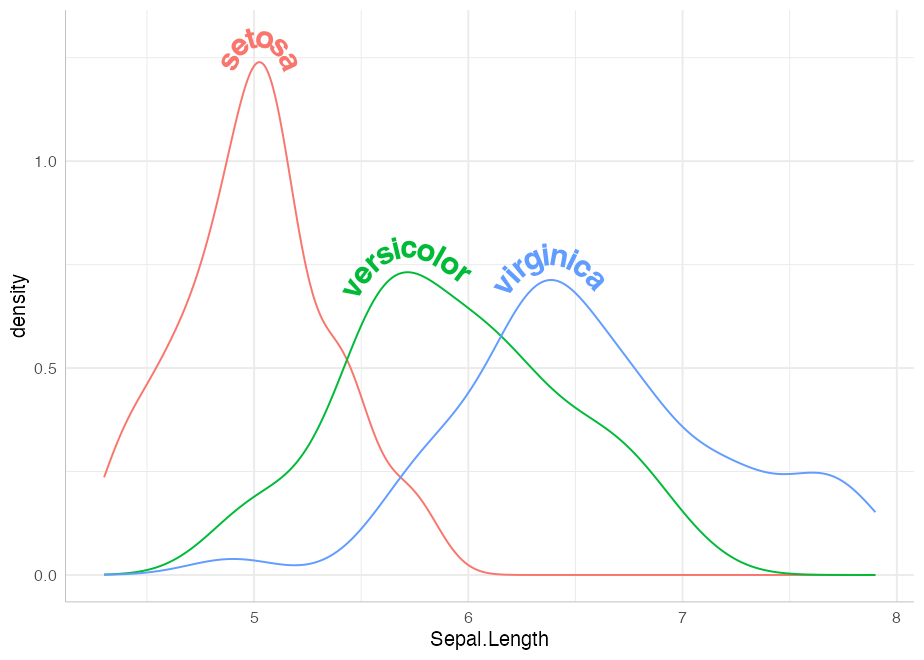 These are the analogues of geom_density that allows for smoothly curved labels on density plots