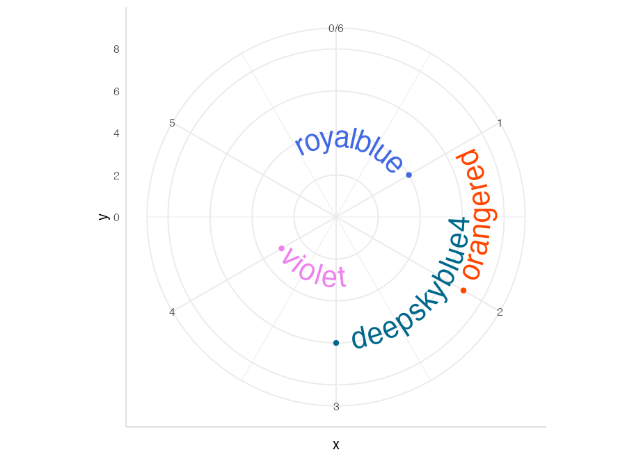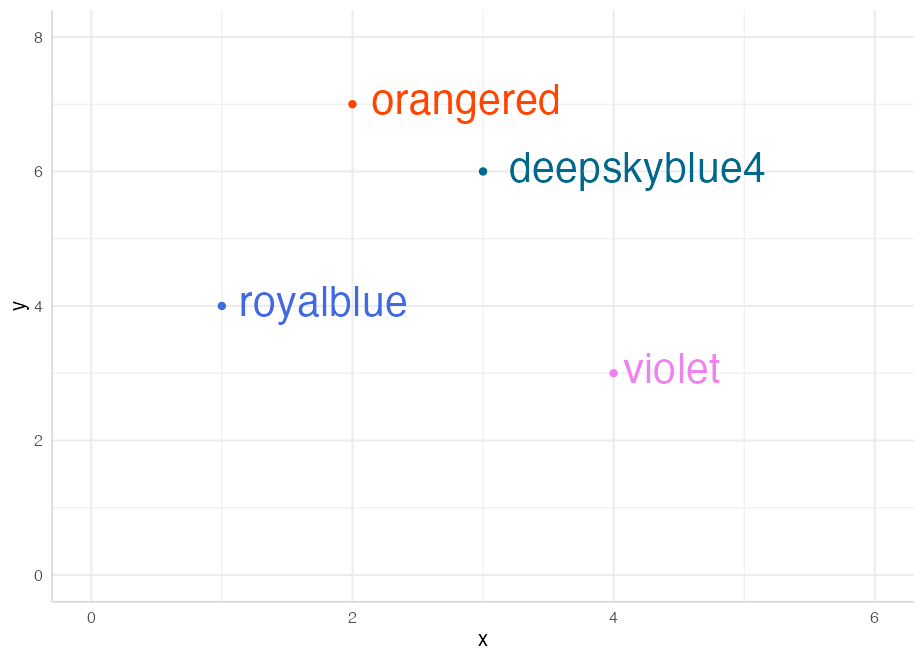 p <- ggplot(df, aes(x, y, color = color, label = color)) +