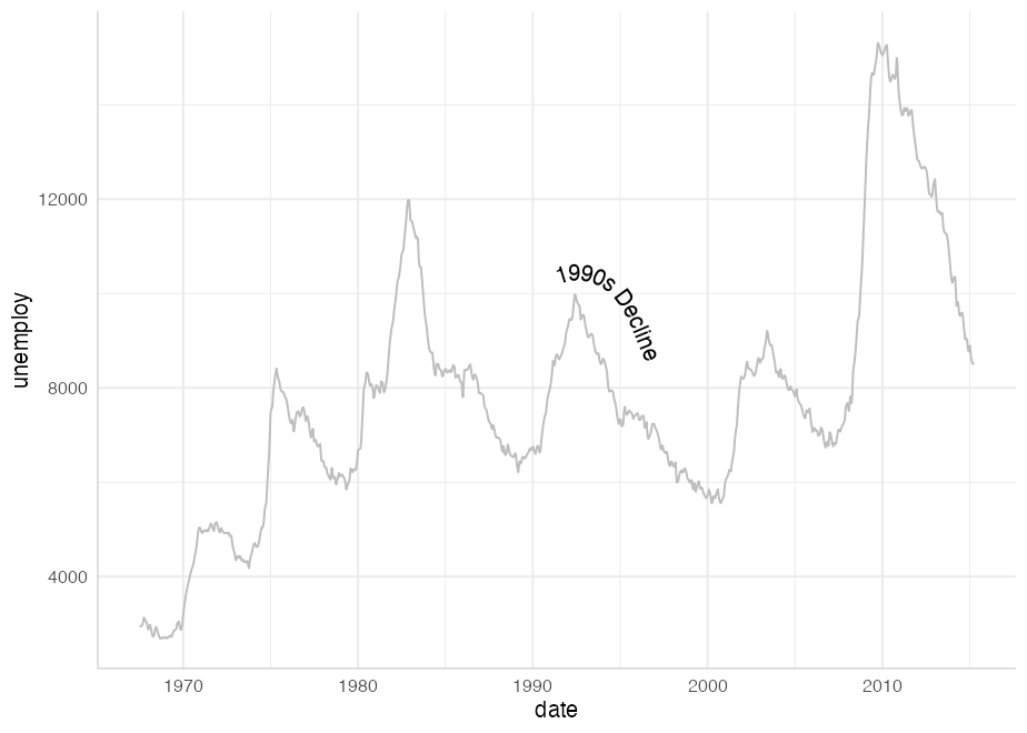 You can use geom_textline and geom_labelline as a drop in for geom_line if you want it directly labelled. Just pass the label you want as an argument to geom_textline (or if you have grouped data, you can pass the label as an aesthetic mapping). As in the other geoms here, you can specify the line’s appearance and the text’s appearance separately.