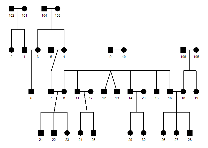 ggpedigree provides modern tools for visualizing family trees and pedigree structures using both ggplot2 and plotly. Specifically, it enables the creation of static and interactive pedigree plots that can accommodate complex family relationships, including duplicated individuals and various mating structures.