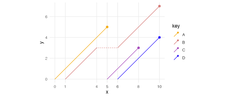 ggplot(df2, aes(x = x, xend = xend, color = key)) +