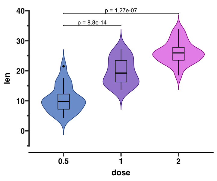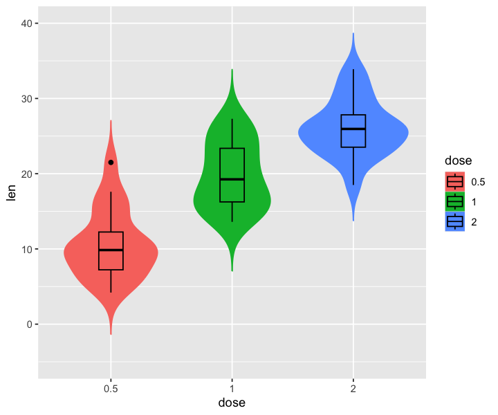 geom_violin(aes(colour = dose, fill = dose), trim = FALSE) +
