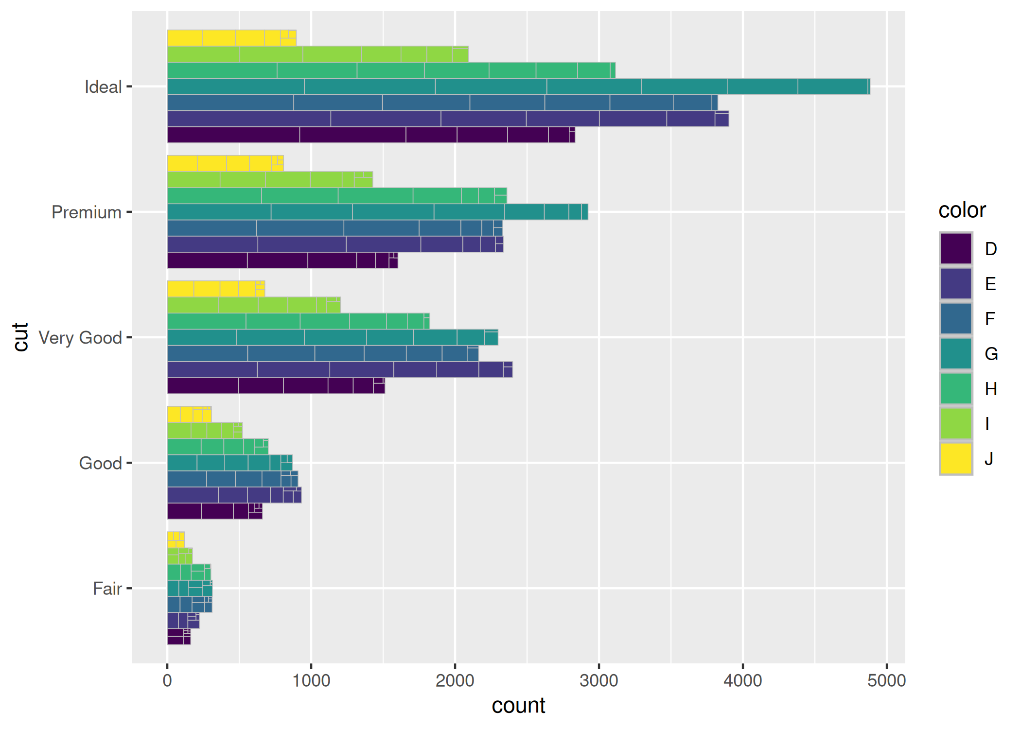 ggplot(diamonds, aes(y = cut, fill = color, subgroup = clarity)) +