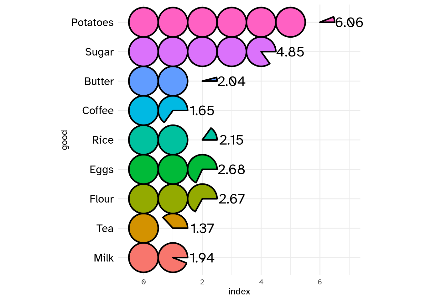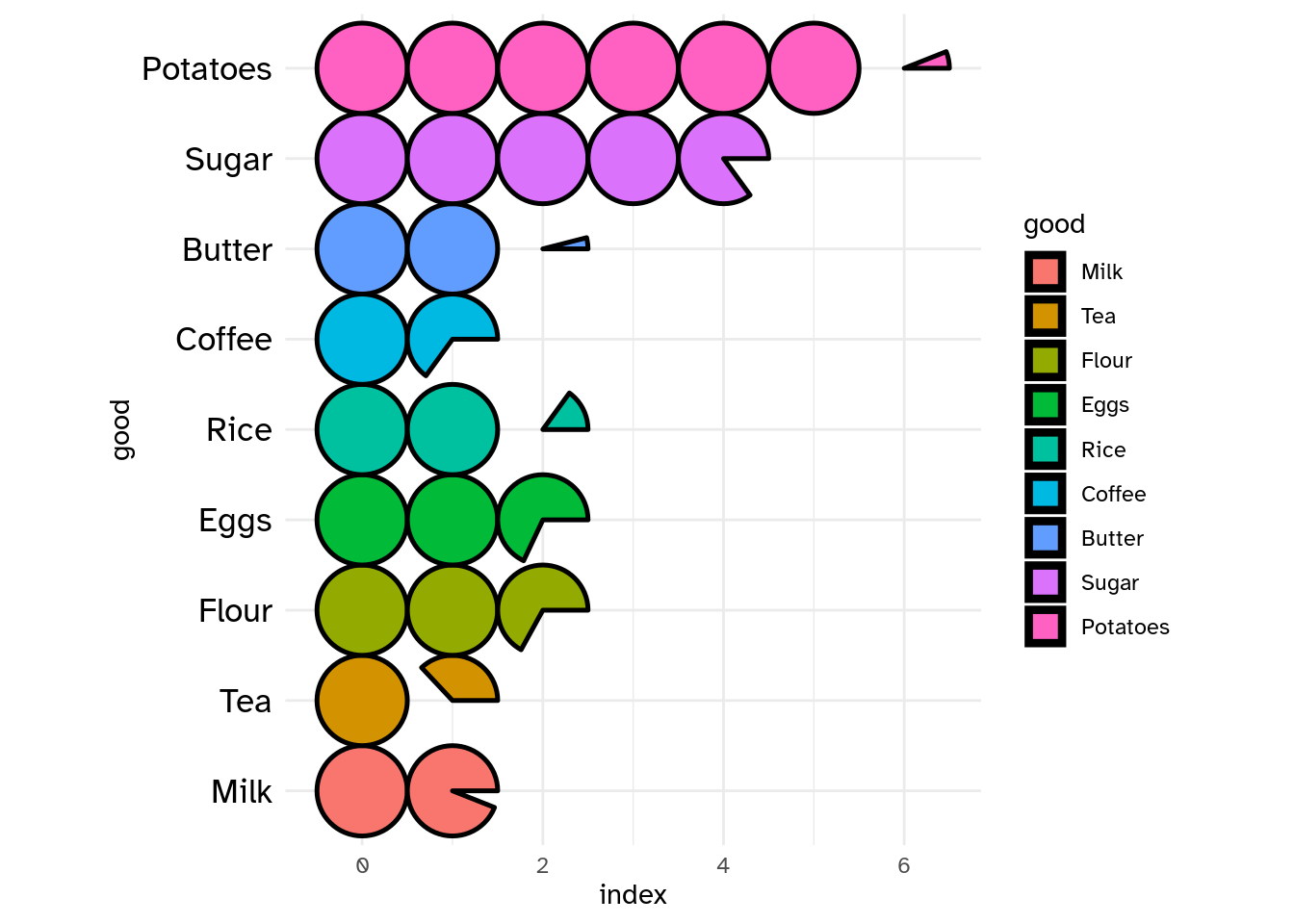 good = c("Potatoes", "Sugar", "Butter", "Coffee", "Rice", "Eggs", "Flour", "Tea", "Milk"),