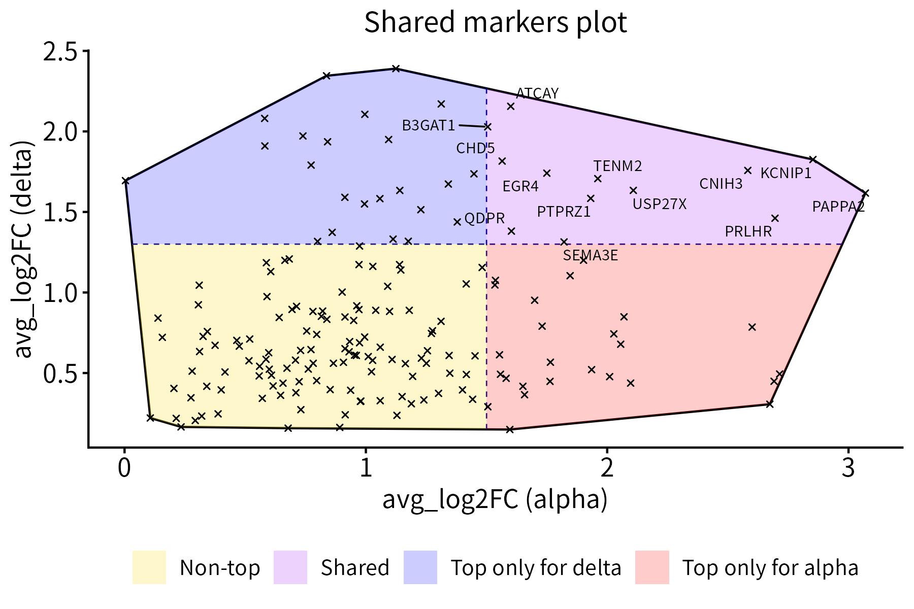 The default option is preferred in the example below. To emphasize the usage of different thresholds for labeling and significance, the thresholds for labeling are set much higher than the thresholds for significance.