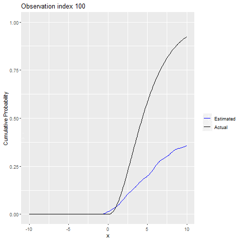 {r eval=FALSE} # Visualize Results for CDF (Not run, requires gganimate, gifski and transformr # packages) p <- ggplot(res,aes(x=x)) + geom_line(aes(y=cdf_est_vals, colour="Estimated")) + geom_line(aes(y=actual_cdf_vals, colour="Actual")) + scale_colour_manual("", breaks = c("Estimated", "Actual"), values = c("blue", "black")) + ylab("Cumulative Probability") + transition_states(idx_vals, transition_length = 2,state_length = 1) + ggtitle('Observation index {closest_state}') anim_save("cdf.gif", p)