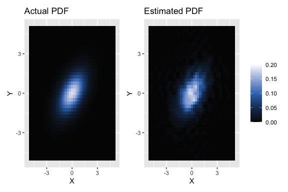 {r eval=FALSE} # Visualize Results for PDF (Not run, requires gganimate, gifski and transformr # packages) p <- ggplot(res,aes(x=x)) + geom_line(aes(y=pdf_est_vals, colour="Estimated")) + geom_line(aes(y=actual_pdf_vals, colour="Actual")) + scale_colour_manual("", breaks = c("Estimated", "Actual"), values = c("blue", "black")) + ylab("Probability Density") + transition_states(idx_vals,transition_length = 2,state_length = 1) + ggtitle('Observation index {closest_state}') anim_save("pdf.gif",p)