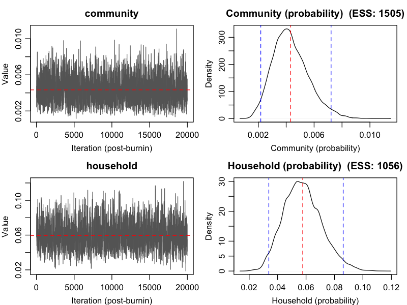 n_iteration = 30000, burnin = 10000)Tsang TK, Cauchemez S, Perera RA, Freeman G, Fang VJ, Ip DK, Leung GM, Malik Peiris JS, Cowling BJ. (2014). Association between antibody titers and protection against influenza virus infection within households. J Infect Dis. 210(5):684-92.