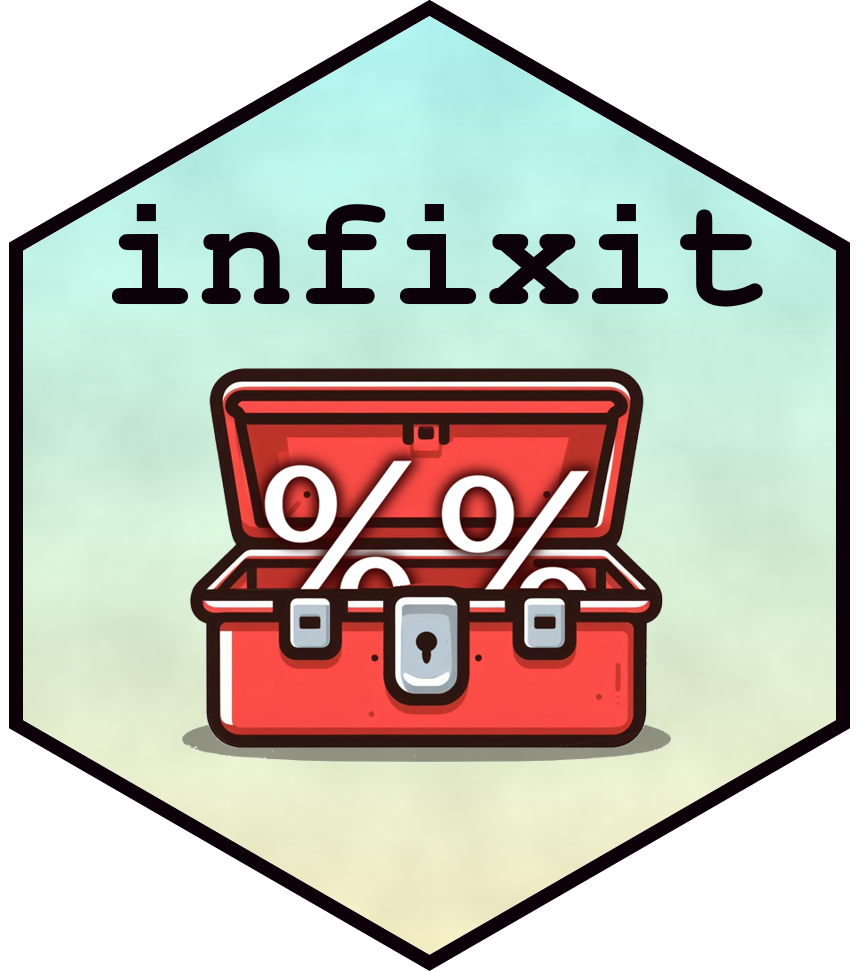 {infixit} is an R package that looks to extend the available infix operators in R with some that are helpful for programming and data manipulation tasks. Additionally, the specific behaviors of many of these operators are (to an extent) customizable using some of the package’s options().