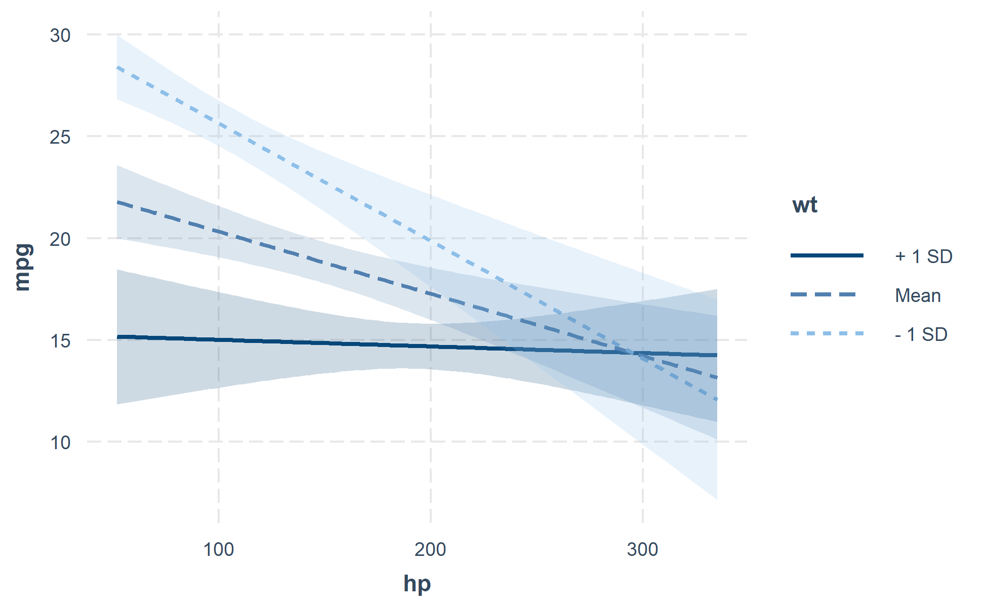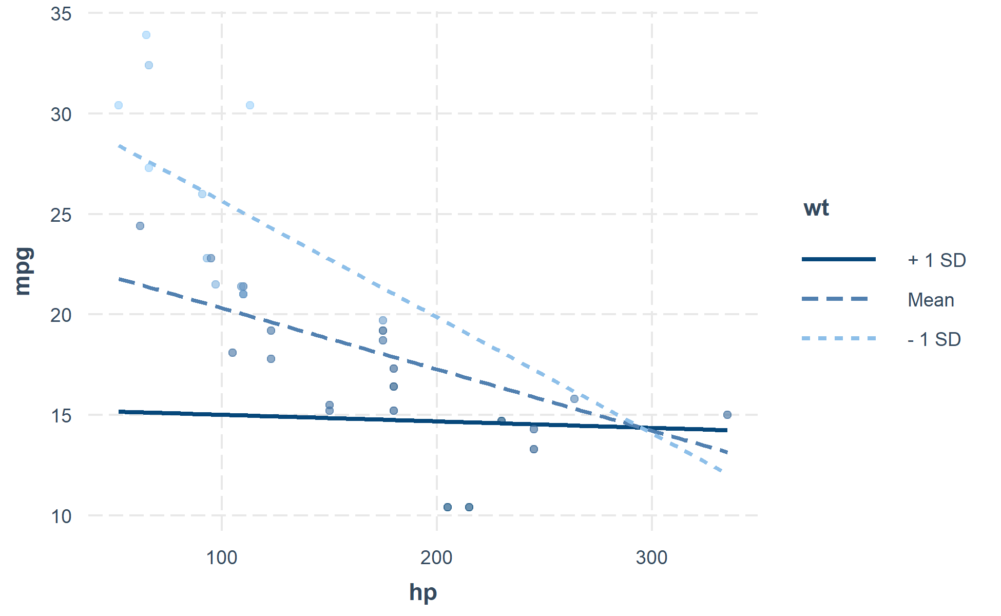 #> Slope of hp when wt = 4.195707 (+ 1 SD):
