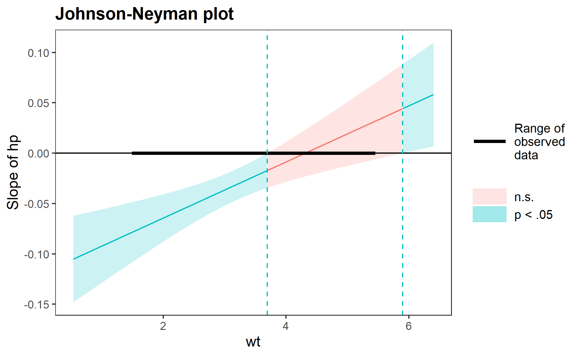 #> When wt is OUTSIDE the interval [3.69, 5.90], the slope of hp is p < .05.