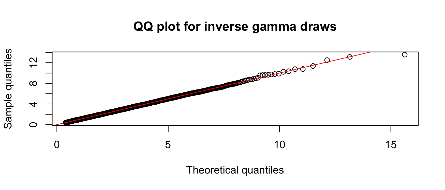 qqplot( "x" = ppoints(n) |> qinvgamma(shape, rate), "y" = draws,
