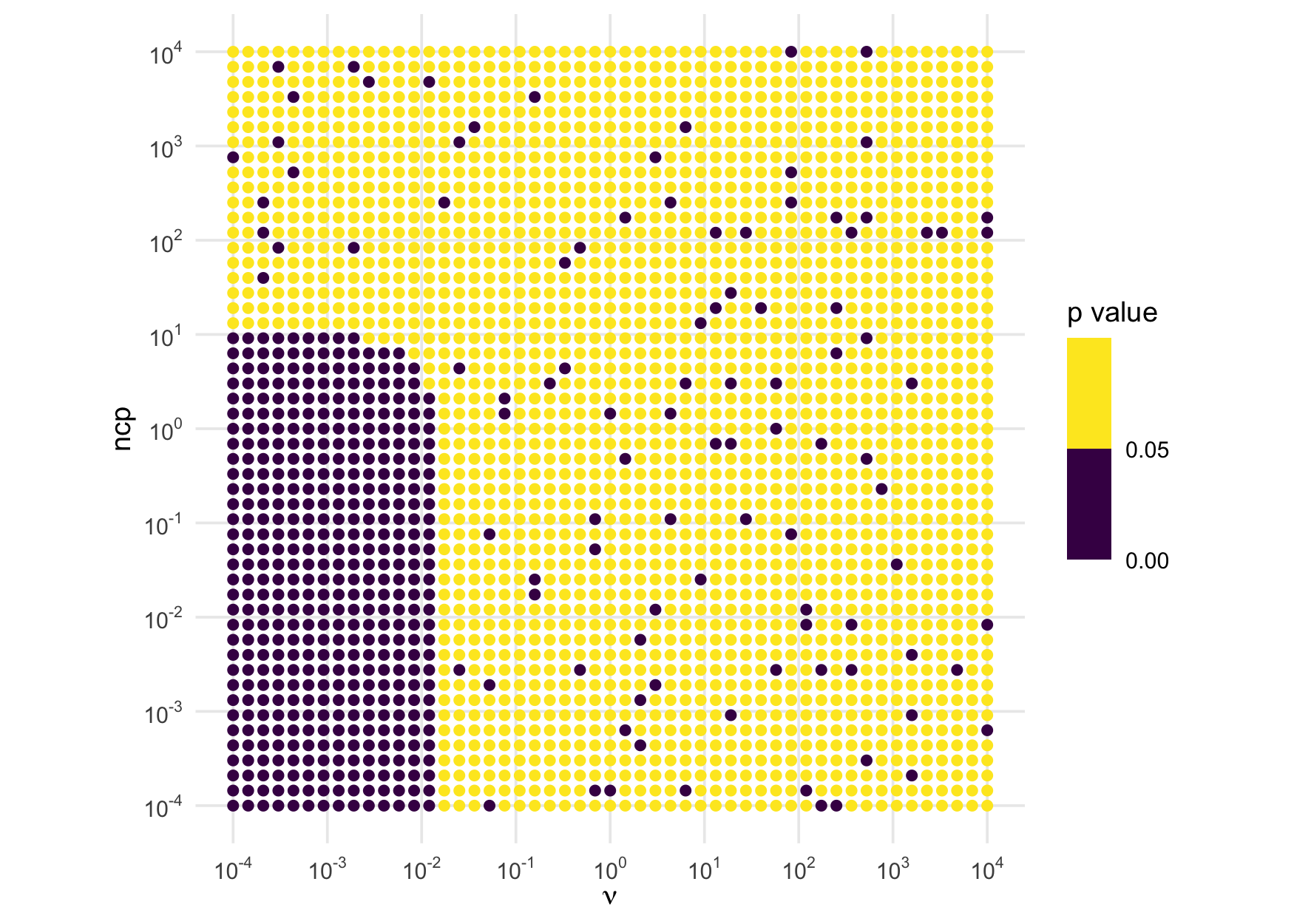 ggplot(aes(df, ncp, color = p_val)) +