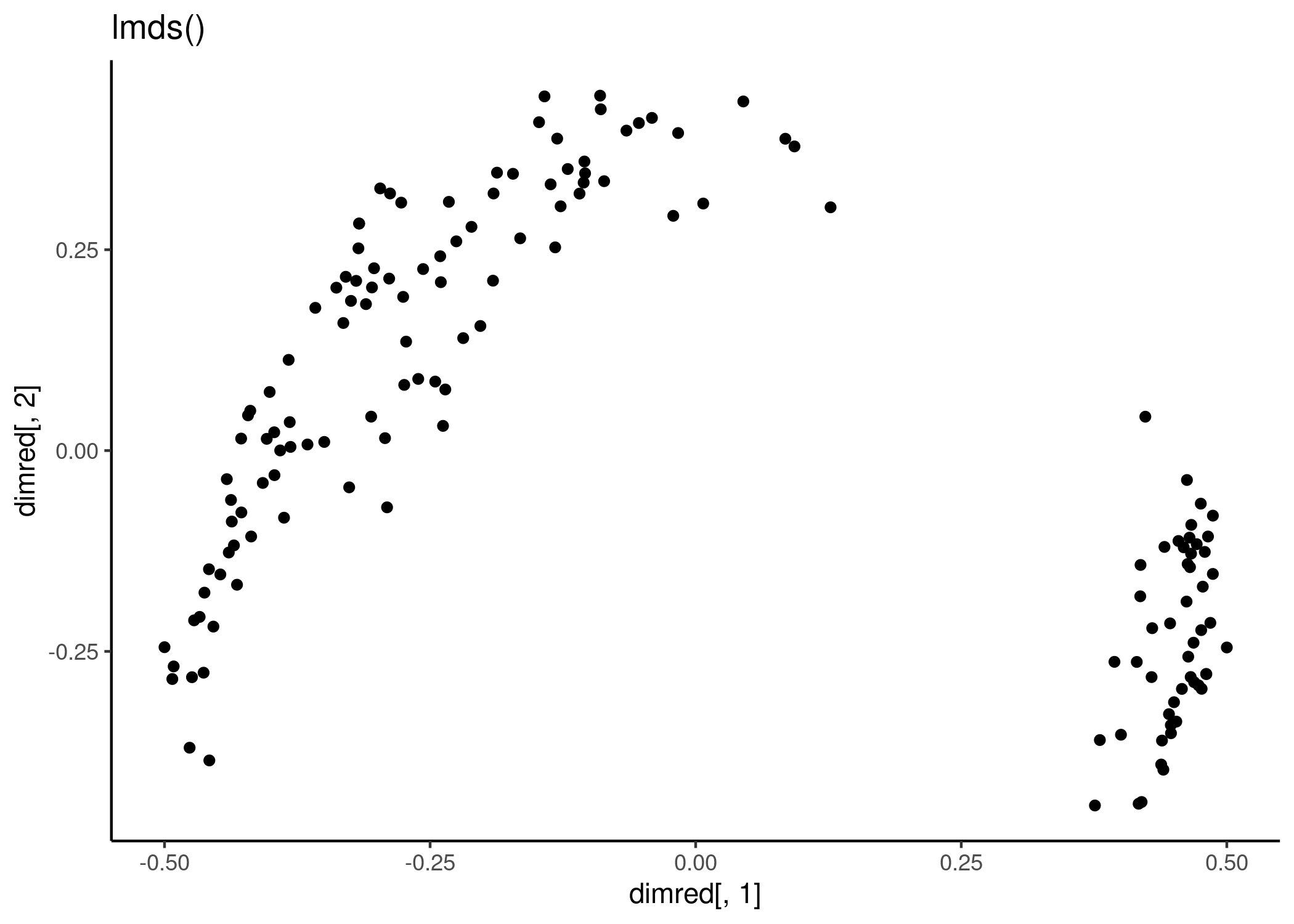 qplot(dimred[,1], dimred[,2]) + labs(title = "lmds()") + theme_classic()