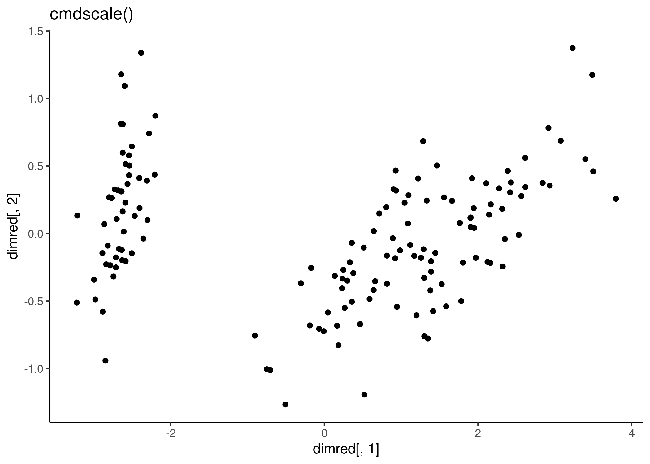 qplot(dimred[,1], dimred[,2]) + labs(title = "cmdscale()") + theme_classic()