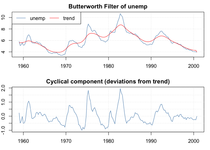 main="Butterworth filter of unemployment: Cycle,drift=TRUE",