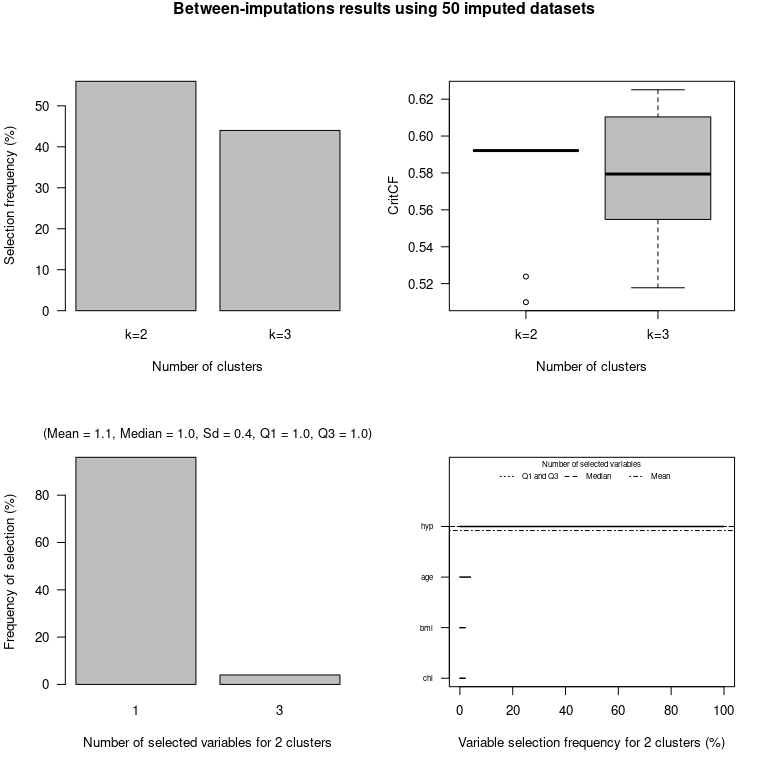 minhanes1clust <- miclust(data = minhanes1, search = "backward", ks = 2:3, usedimp = 1:50, seed = 4321)